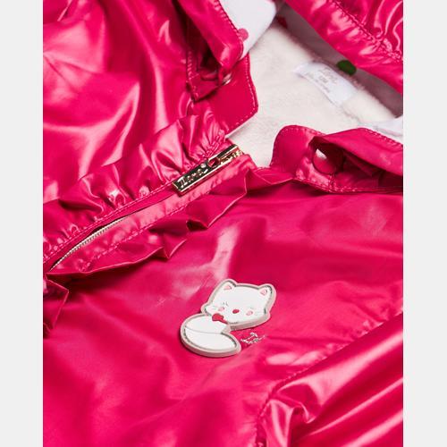 Duster kaput s volanima i IANA kapuljačom za novorođenče|Duster kaput s kapuljačom, punim patentnim zatvaračem i volanima. Dva džepa. Elastične manšete i aplikacija na lijevoj grudi. Podstava kapuljače od tiskanog pamuka i podstava jakne od bijelog umjetnog krzna.
