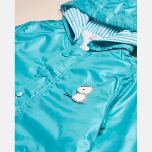 IANA jakna s kapuljačom za novorođenče|Jakna s kapuljačom i dva prednja džepa. Aplikacija lijeve dojke. Potpuni patentni zatvarač i otvaranje na gumb. Prugasta pamučna podstava kapuljače i podstava jakne od umjetnog krzna. Elastične manžete i donji dio.