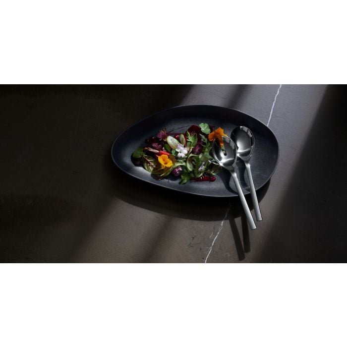 Hrskave varijacije salata u svim bojama, možda obogaćene sirovim povrćem, voćem, prženim pilećim prsima ili škampima: nema problema za hvataljke za salatu Nuova. Plosnate, vrlo izdašne hvataljke savršene su za miješanje, porcioniranje i posluživanje, a također omogućuju da se višak preljeva lako ocijedi. Duge ručke osiguravaju opušteno rukovanje. Set pribora za jelo Nuova salata isporučuje se u visokokvalitetnoj, ilustriranoj sklopivoj kutiji, koja također dobro izgleda kao poklon pakiranje. Kolekcija pribora za jelo Nuova iz WMF-a uključuje gotovo 50 posebnih komada pribora za jelo - od hvataljki za tjesteninu do žlica za med, od pribora za jelo za ribu do noževa za sir. Svojim bezvremenskim, jednostavnim dizajnom Nuova ne samo da se uklapa u svaki ambijent, već i uz svaki drugi pribor za jelo. Svi dijelovi pribora za jelo savršeno leže u ruci i oduševljavaju svojom maksimalnom funkcionalnošću u svakodnevnom životu. Izrađena od visokokvalitetnog Cromargan®: nehrđajućeg čelika 18/10, Nuova se naravno lako čisti, može se prati u perilici posuđa, potpuno je bez okusa, vrlo izdržljiva i otporna na prehrambene kiseline.