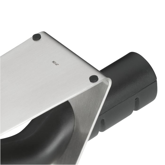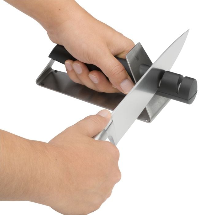 Ovisno o tome koliko često se kuhinjski noževi koriste u kućnoj kuhinji i na kojoj podlozi se režu, prije ili kasnije bit će potrebno naoštriti oštrice svih noževa. Budući da rukovanje čelikom za oštrenje zahtijeva određeno iskustvo, gurmanski oštrač noževa tvrtke WMF dobra je alternativa za neiskusne ljude. Ovo zapravo čini oštrenje noževa dječjom igrom u dvije faze: Nož se jednostavno nekoliko puta uzastopno provede kroz integrirane proreze za vodilice - prvo dugotrajni keramički diskovi oštre oštricu, zatim je fini keramički diskovi poliraju - gotovo! U međuvremenu, neklizajuće noge osiguravaju stabilnost i sigurno rukovanje. Oštrilo noževa Gourmet prikladno je za sve oštrice s ravnim brušenjem - uključujući oštrice s WMF Performance Cut tehnologijom.