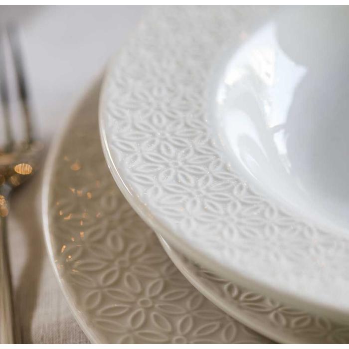 Bijeli porculanski desertni tanjur iz linije Olimpia Margaret ima promjer od 19 cm.Marke "Tognana", ovaj tanjur s reljefnim cvjetnim ukrasima na rubu savršeno spaja klasični i moderni stil, te izgleda profinjeno i elegantno. Idealan je za posebne prilike.Iz iste linije dostupni su tanjuri različitih veličina, dodaci i drugi elementi, za stvaranje kompletnog stolnog servisa.Tanjur je periv u perilici posuđa i prikladan za korištenje u mikrovalnoj pećnici.